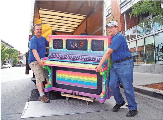Jeff Weimar (left) and Adam Miller with West Music unload the first of 10 pianos they are placing around downtown Des Moines on Tuesday outside of RAYGUN in the East Village. The pianos were installed as part of City Sounds’ annual public piano project, and will be in place through late September.