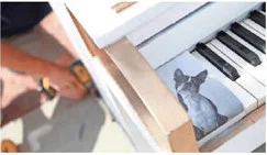 A photo of a dog decorates the keyboard as Andre Drost with ACR Construction anchors the piano to the ground.